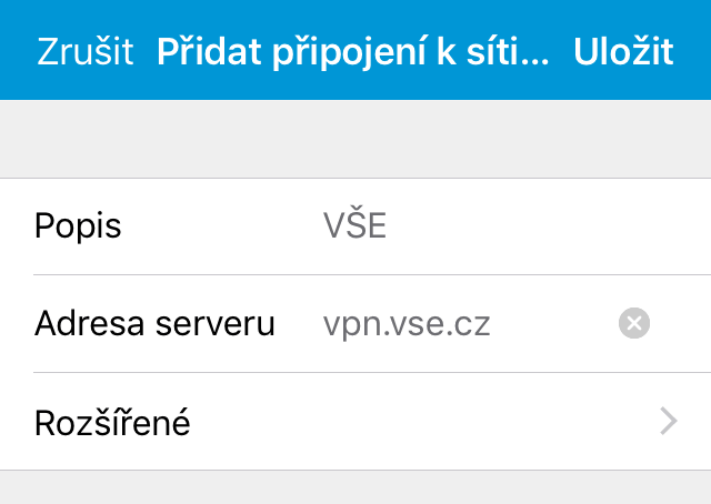 2. Zadejte vhodný popis a jako adresu serveru vložte vpn.vse.cz. Nastavení uložte.