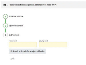 Posledním krokem potvrdíte spárování s ověřovací aplikací. Zadejte první kód, pak počkejte, než se kód změní (do 30s) a zadejte druhý.